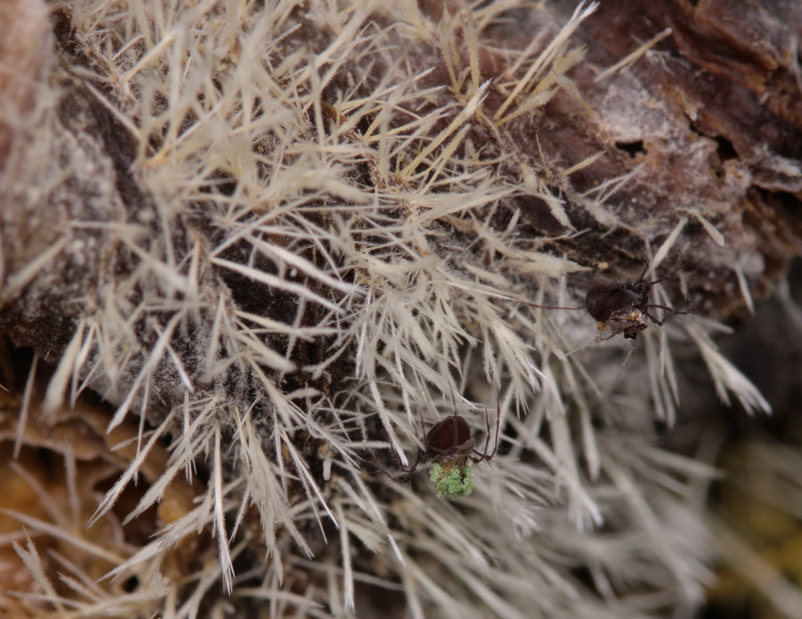 | Has anyone any idea what the two Arachnids, wearing the latest in Lichen haute couture are? They were around 5mm across |